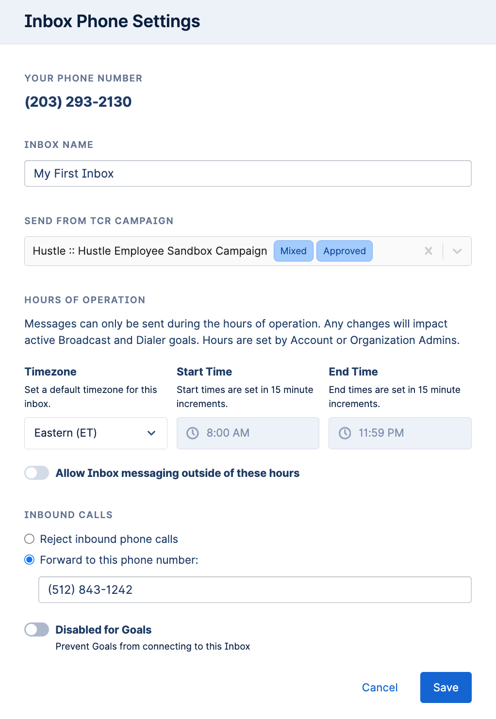 In the Inbox Phone Settings, admins can view and edit inbox details including the Inbox Name, TCR campaign, hours of operation, and inbound call routing.